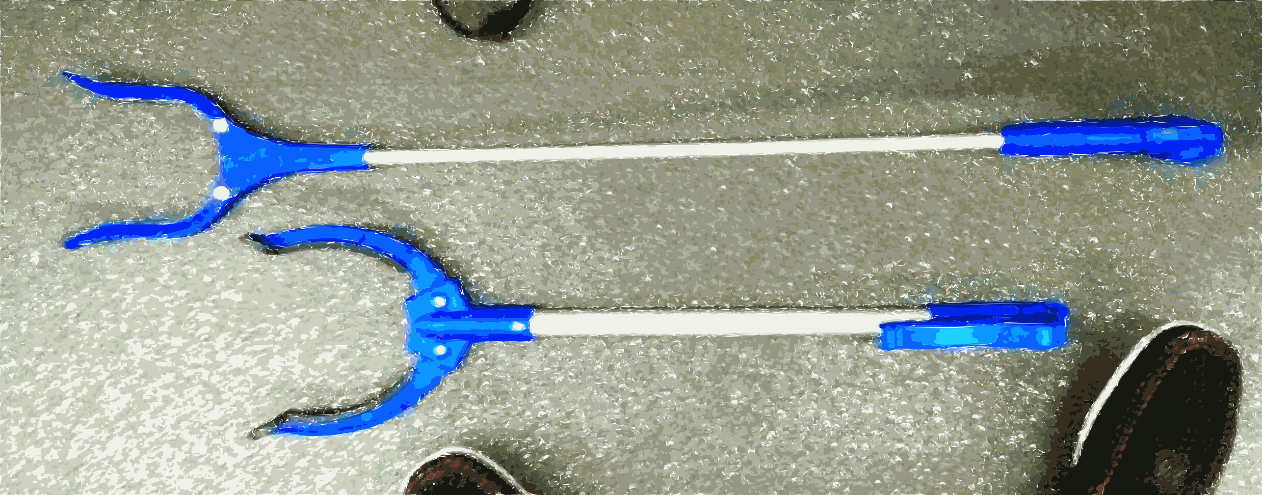 This features a pair of blue and white trash picker uppers, also known as TPUs. These environmentally friendly tools are designed to help clean up the world by making it easy for people to collect litter from streets and other public spaces. Each TPU has a unique design with one being larger than the other, but both have blue handles that make them easily identifiable. The image also shows a person standing in front of these trash picker uppers, possibly admiring or using them for their intended purpose.