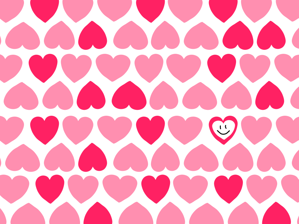 This features a large pattern of hearts, with each row pointing in different directions. The hearts are arranged in various orientations and are colored red and pink. There is also a single heart that stands out from the rest, as it is positioned slightly apart from the others. This unique heart appears to be smiling, adding a playful touch to the overall design of the pattern.