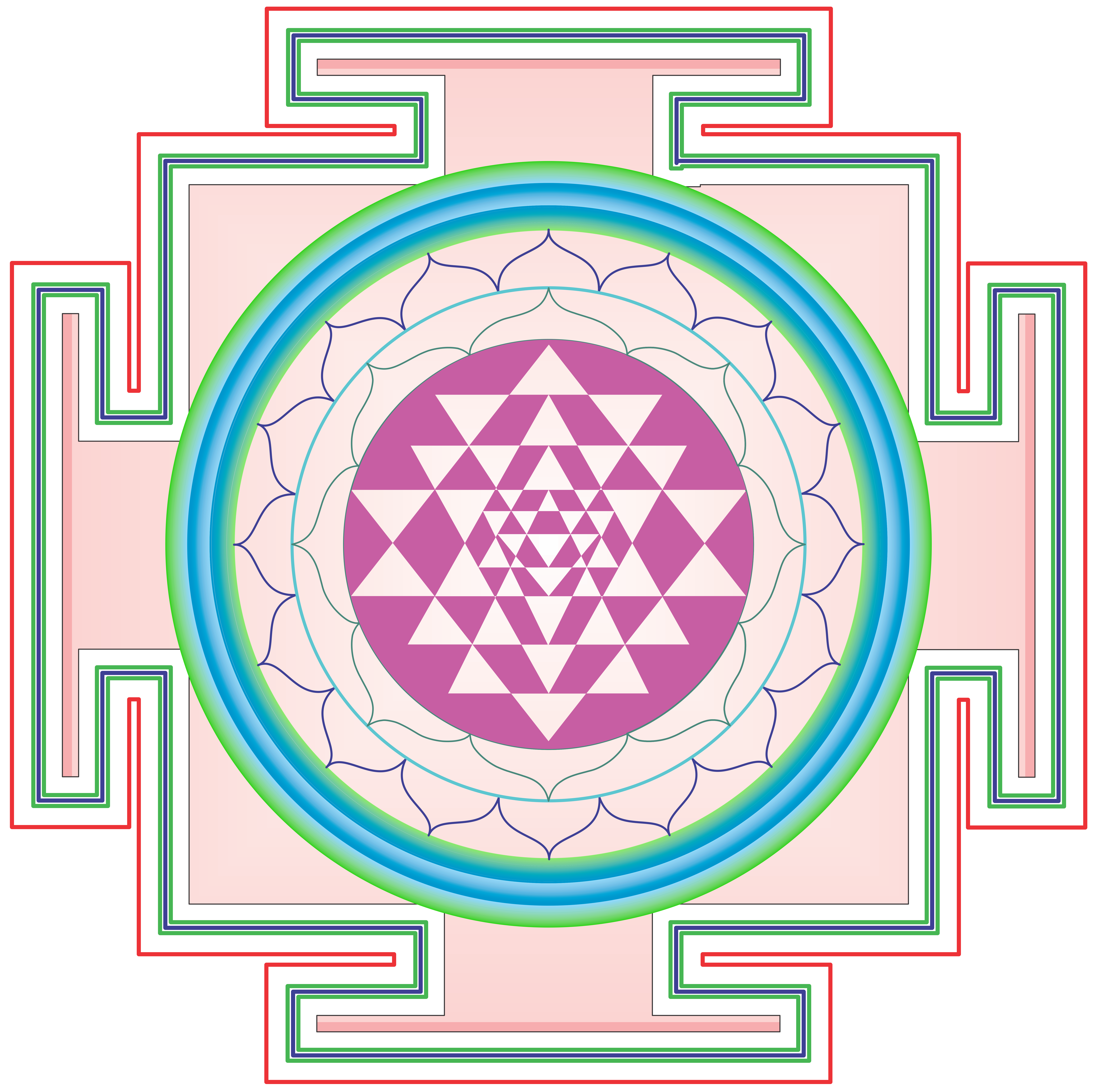 This features a large, colorful mandala with a pink background. It is adorned with intricate designs and patterns that create an eye-catching visual effect. The mandala has a teal circle at its center, which is surrounded by flower petals and a triangle pattern. This design gives the impression of a three-dimensional structure, adding depth to the overall appearance. The mandala's vibrant colors and intricate patterns make it an attractive piece of art that can be appreciated for both its beauty and symbolism.