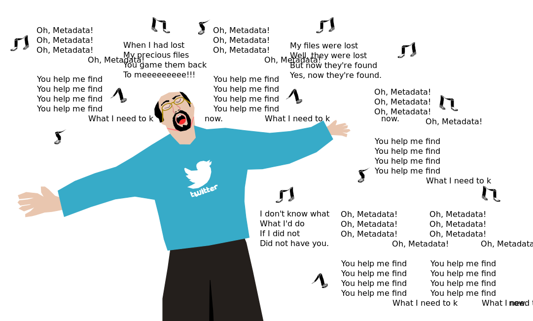 This features a man wearing a blue shirt with the Twitter logo on it, standing in front of a wall filled with music notes. He appears to be singing or expressing himself through song lyrics that are scattered across the wall. The man is also holding his arms out wide, possibly indicating excitement or passion for the music he's singing about. The scene captures a moment where the man is fully immersed in his musical expression and surrounded by the notes of his song.