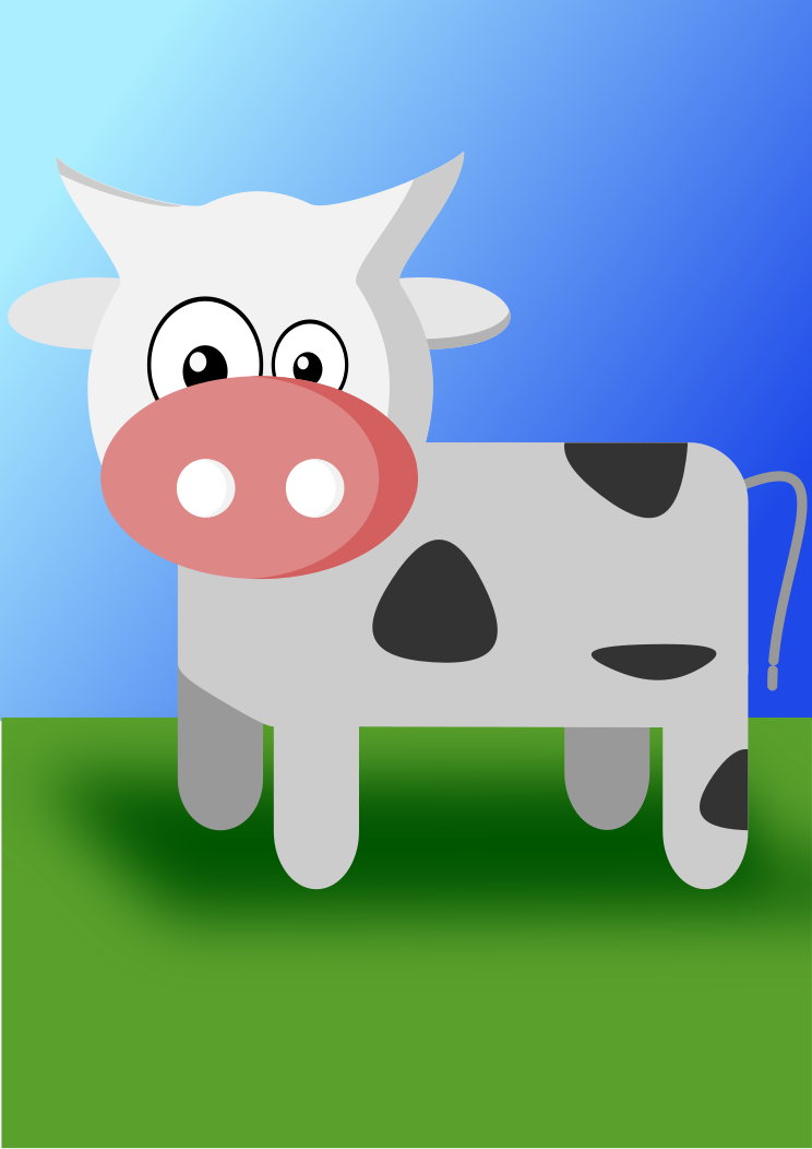 This features a cartoon cow with a pink nose and black spots, standing in a grassy field. It appears to be looking at the camera, giving it a cute and friendly appearance. The cow is positioned towards the left side of the frame, taking up most of the space within the image. The background consists of a blue sky, which adds to the overall pleasant atmosphere of the scene.