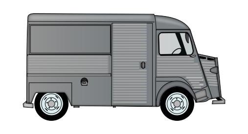 This features a large, gray truck with two tires visible. It has a big door and blinds on the window. The truck appears to be an old model, possibly used for transportation purposes. The color of the truck is predominantly gray, giving it a classic appearance.