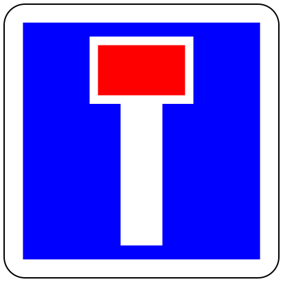 This features a blue and white sign with a red circle in the middle. This sign is likely indicating a dead end or restricted area, as it has been described as such before. The sign's design is square-shaped, which makes it stand out against its surroundings. The combination of colors - blue for the background, white for the outline, and red for the circle - creates a visually appealing contrast that draws attention to the sign.