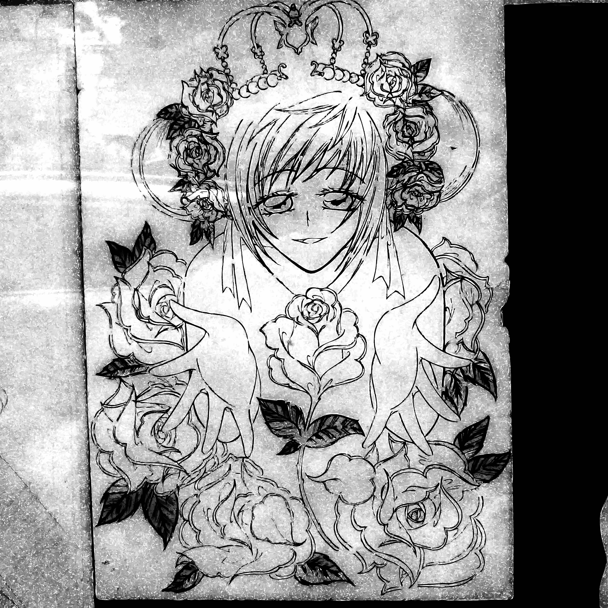 This features a black and white drawing of a woman with flowers in her hair. She is wearing a crown, which adds to the elegance of the scene. The woman appears to be looking downward, possibly contemplating something or lost in thought. The drawing showcases her facial expression and emotions, making it an intriguing piece of artwork.