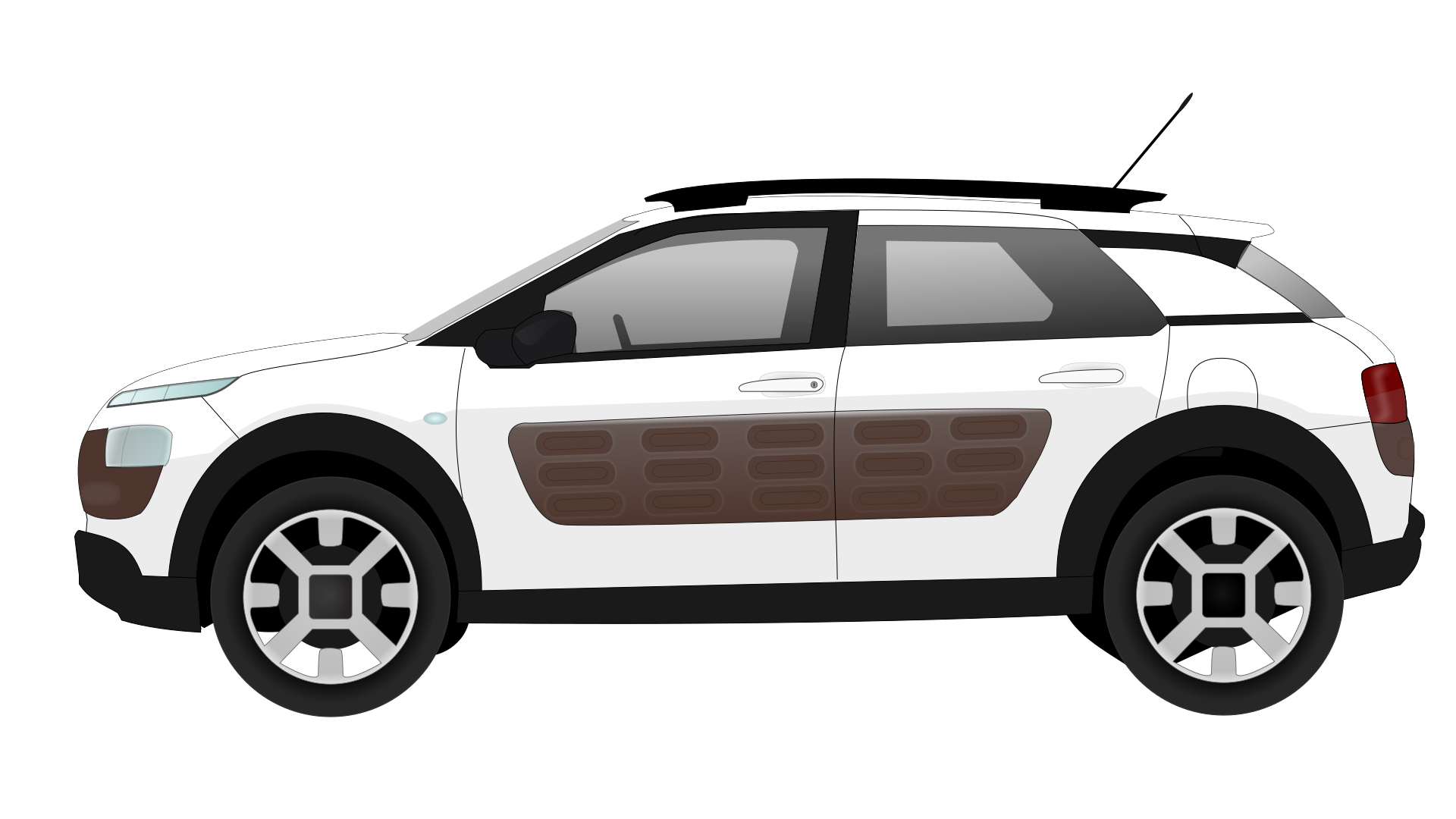This features a white crossover SUV, which is an illustration of the Citroen C4 Cactus. This car model has a unique design with its rounded edges and distinctive shape. It appears to be parked on a flat surface, possibly in front of a building or other structure. The vehicle's positioning suggests that it may be waiting for someone or simply parked as part of the scene. Overall, this illustration captures the essence of the Citroen C4 Cactus and its distinctive design elements.