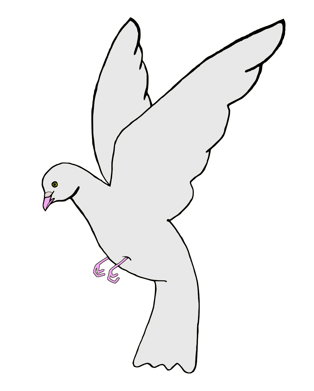 This features a dove flying in the air with its feet spread out. It is a simple, black and white drawing of the bird against a light background. The dove's wings are open wide as it soars through the sky, giving an impression of freedom and grace. This artistic representation of the dove captures the essence of peace and tranquility often associated with this symbolic creature.