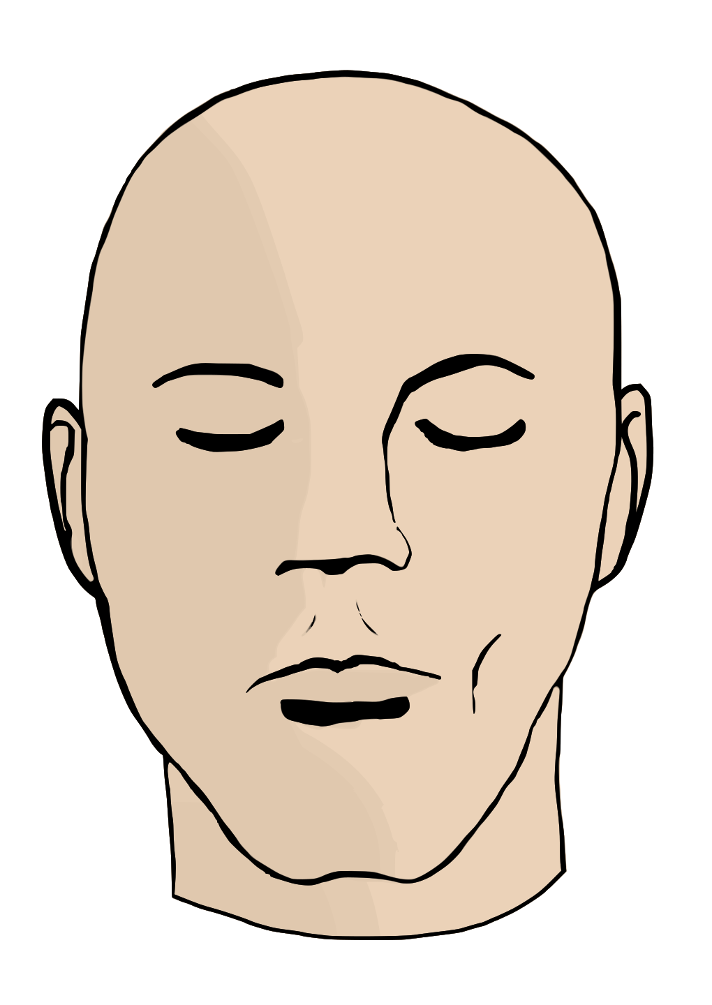 This features a close-up of a man's head with his eyes closed. He has a bald head and is wearing glasses, giving him a thoughtful appearance. The drawing is in black and white, which adds to the simplicity of the scene. The man appears to be looking upwards or staring into the distance, possibly contemplating something or lost in thought.