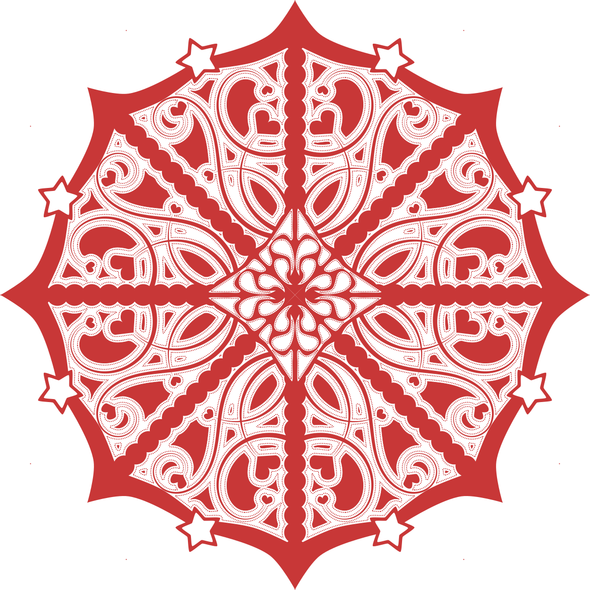 This features a large, intricate red and white design that resembles an ornate star pattern. The star is the central focus of the design, with its outline adorned with small white stars. The overall appearance of the design gives it a unique and artistic look. The color scheme of red and white adds to the visual appeal of the piece, making it stand out as a striking decorative element.