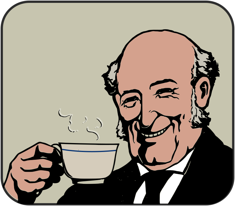 This features a man with white hair and a mustache, wearing a suit and tie. He is holding a cup of coffee in his hand while smiling at the camera. The background of the picture is light beige, giving it an old-fashioned appearance. The man appears to be enjoying his hot drink, possibly tea or coffee, as he poses for the photo.