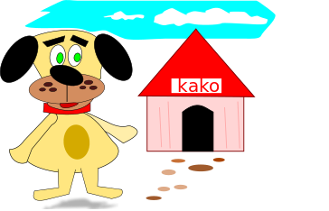 This features a cartoon dog standing in front of a red house with the word "Kako" written on it. The dog appears to be walking towards the house, giving off an impression that it is entering or leaving the home. The scene has a playful and whimsical atmosphere, as the dog seems to be interacting with its surroundings in a lighthearted manner.