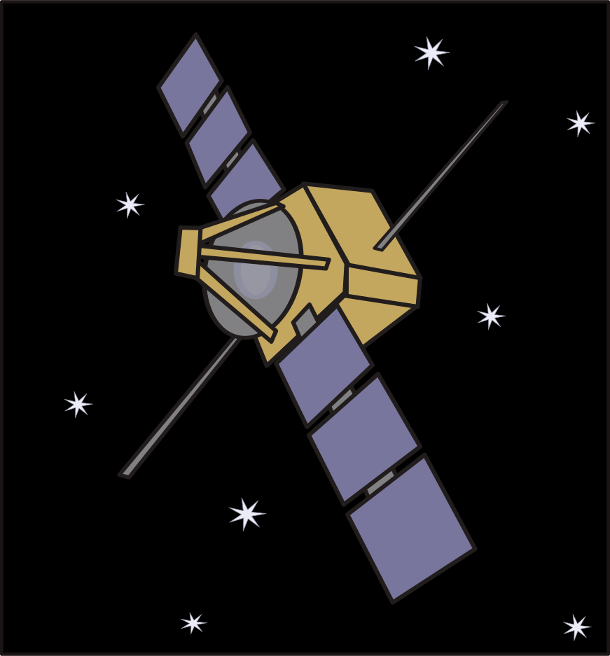 This features a spacecraft with a satellite dish and two antennas. The spacecraft is positioned in the middle of the scene, surrounded by stars that create a backdrop for this celestial object. The satellite itself has a yellow and grey color scheme, making it stand out against the dark background. This intriguing image captures the essence of space exploration and the marvels of modern technology.