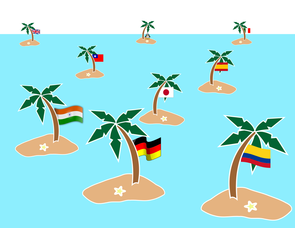 This features a large body of water with numerous small islands scattered throughout. Each island is topped with a palm tree, and there are various flags displayed on the trees. The flags represent different countries, adding an interesting visual element to the scene. The combination of the blue water, palm trees, and flags creates a unique and colorful atmosphere in this image.