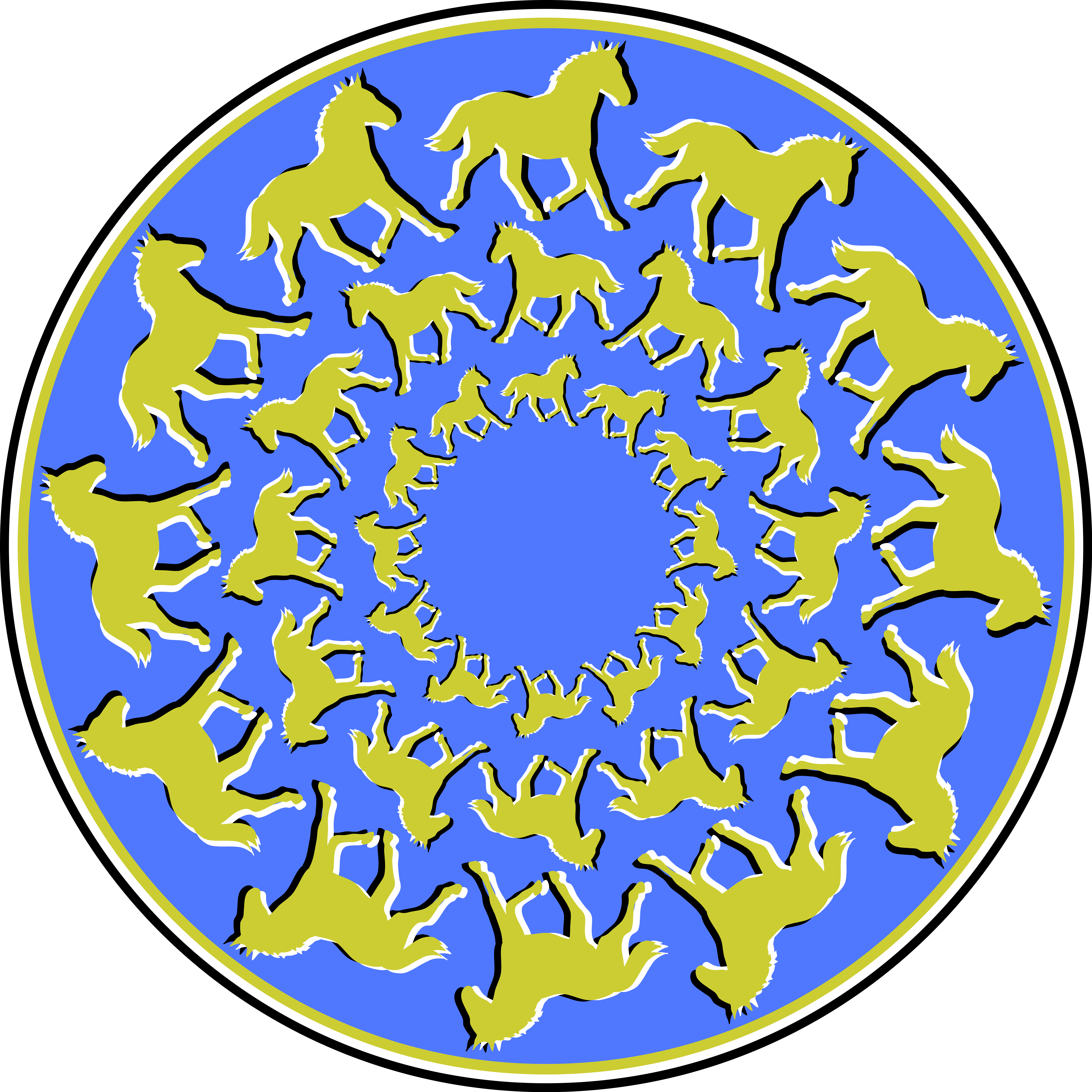 This features a blue circular design with a center that resembles a horse. This central horse is surrounded by numerous smaller horses, creating an intricate and visually appealing pattern. There are at least 13 horses in total, each varying in size and position relative to the central horse. Some of these horses are located closer to the edge of the circle while others are more centrally placed. The overall effect is a captivating display of horses arranged around the central figure.