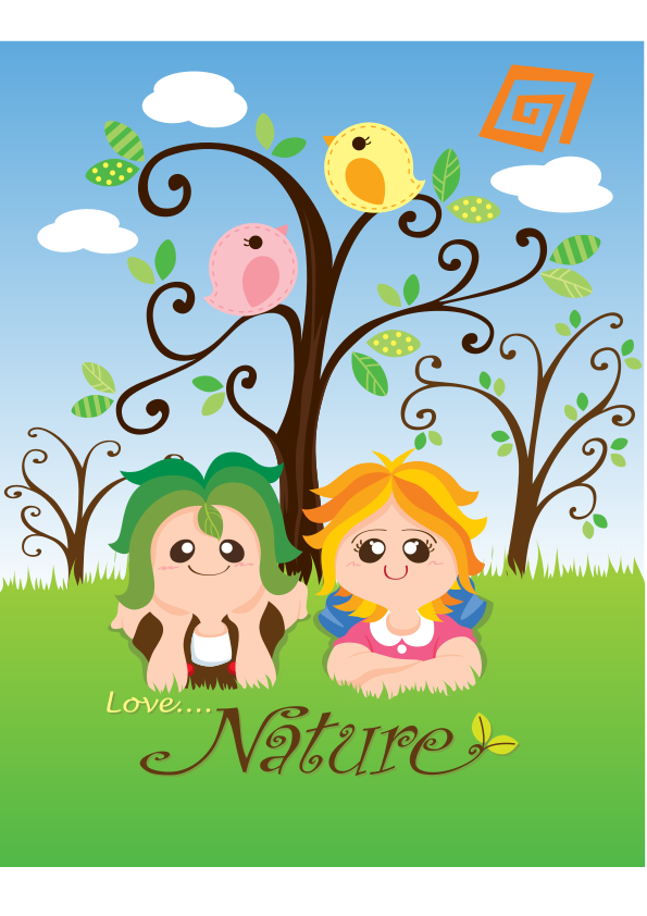 This features two cartoon children sitting on the grass under a tree. They are surrounded by various birds, with some perched in the branches of the tree and others flying around them. The scene is set against a backdrop of clouds, adding to the whimsical atmosphere. The overall composition creates an impression of a peaceful, nature-filled environment where the children can enjoy their time outdoors.