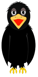 This features a black bird with its beak open, standing in the foreground. It appears to be a cartoon or illustration of a crow, possibly a baby one. The bird is positioned on a white background, which makes it stand out prominently against the lighter color. Its mouth is wide open, giving an impression that it might be making a funny face or expressing some emotion. Overall, this image captures a unique and playful representation of a black bird with its beak open.