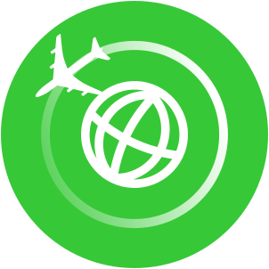This features a green circle with an airplane flying through the sky. The plane is positioned in the upper left portion of the circle, and it appears to be ascending into the sky. The circle itself has a white globe on it, which adds contrast to the overall design. This logo could represent travel or transportation, as the airplane symbolizes movement and exploration.