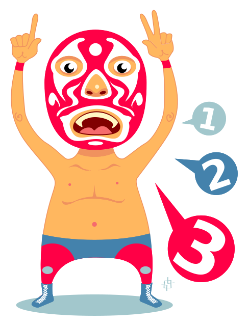 This features a cartoon character, possibly a wrestler or luchador, wearing a red mask and holding up two fingers. This character is standing in the center of the scene with its arms raised above its head, giving off an energetic vibe. The character appears to be counting from one to three, as indicated by the numbered arrows surrounding it. The overall atmosphere of the image suggests a fun and playful theme, possibly related to sports or entertainment.