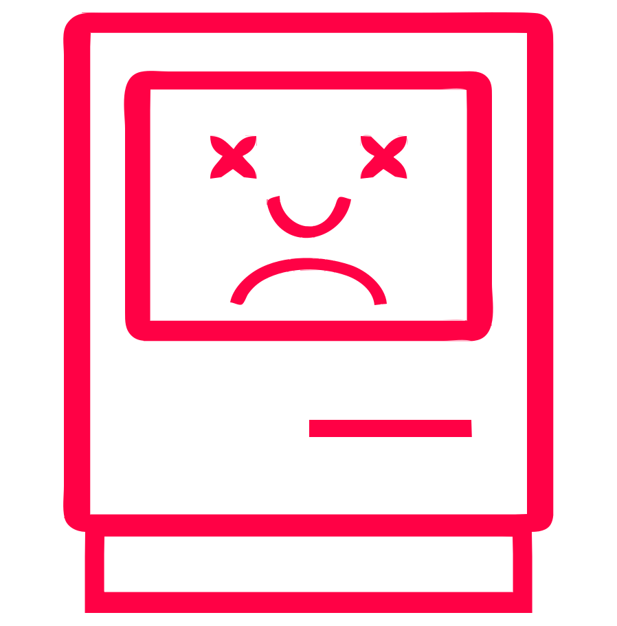 This features a red outline of an Apple computer, with the iconic smiley face drawn on it. This design gives the impression that the computer is happy and in good working order. However, the red color used to outline the computer creates a contrasting effect, making it appear as if the computer is dead or malfunctioning. The combination of the smiley face and the red outline creates an interesting visual representation of a computer's emotions.