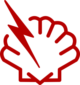 This features a red and white shell-shaped logo, which is likely an emblem for a company or organization. The shell has a lightning bolt symbol in the center of it, adding to its unique design. This logo appears to be used as a visual representation of the brand's identity, possibly related to energy or technology. The combination of red and white colors gives the logo a bold and eye-catching appearance that can easily be recognized by potential customers or members of the organization.