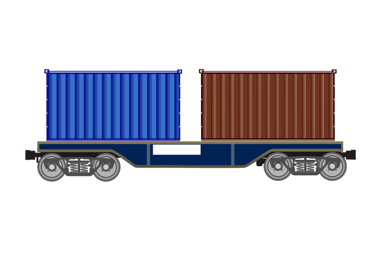 This features a train with two cargo containers on its flatbed. One container is blue, and the other one is brown. Both are placed side by side, creating an interesting contrast in color. The train itself has four wheels visible, providing stability as it moves along its route. This illustration showcases the transportation of goods using a train, highlighting the importance of railways for efficient logistics and trade.