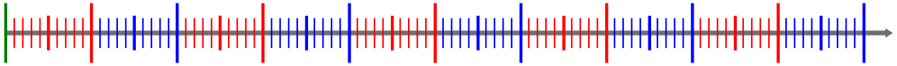 This displays a line of various colors, including red, blue, and white. These colors are arranged in a pattern that resembles a natural number line from 0 to 100 without numbers. The line is composed of multiple segments, each with different colors, creating an interesting visual effect. This unique design could be used for educational purposes or as a creative art piece.