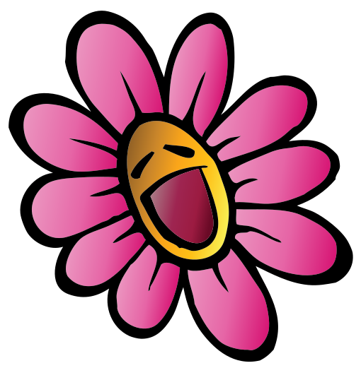 This features a pink cartoon flower with a yellow face, giving it the appearance of smiling. The flower's mouth is wide open, showing its teeth and tongue in a playful manner. This whimsical design adds a touch of humor to the otherwise simple floral motif. The vibrant colors of the flower and the yellow face make it an eye-catching and cheerful image that can be used for various purposes such as decoration, greeting cards or even as a character in a children's storybook.