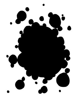 This features a black and white picture of a splattered paint blob. The blob is surrounded by numerous small dots, which are scattered throughout the scene. These dots vary in size and position, creating an interesting visual effect. The overall composition of the image gives it a somewhat chaotic appearance, with the splattered paint blob being the focal point amidst the various dots.