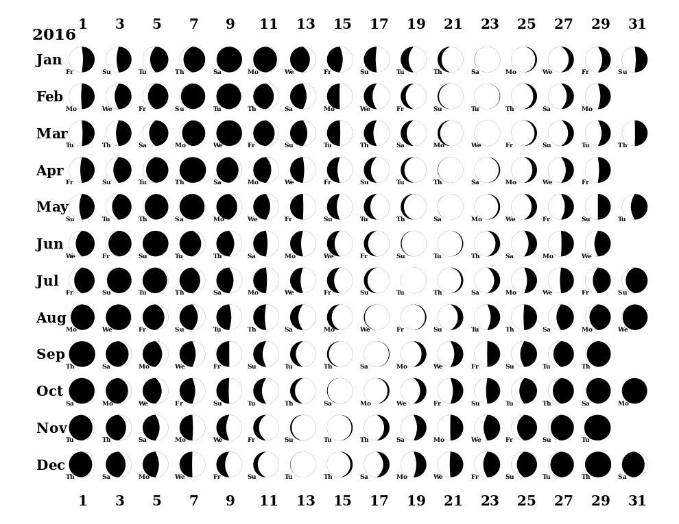 This displays a calendar for the year 2016, featuring moon phases. Each day of the month is marked with a circle, and the corresponding moon phase is indicated by a small circle or a crescent moon shape. There are twelve circles in total, each representing one of the twelve months of the year. The moon phases vary from full to new, providing an interesting visual representation of the lunar cycle throughout the year.
