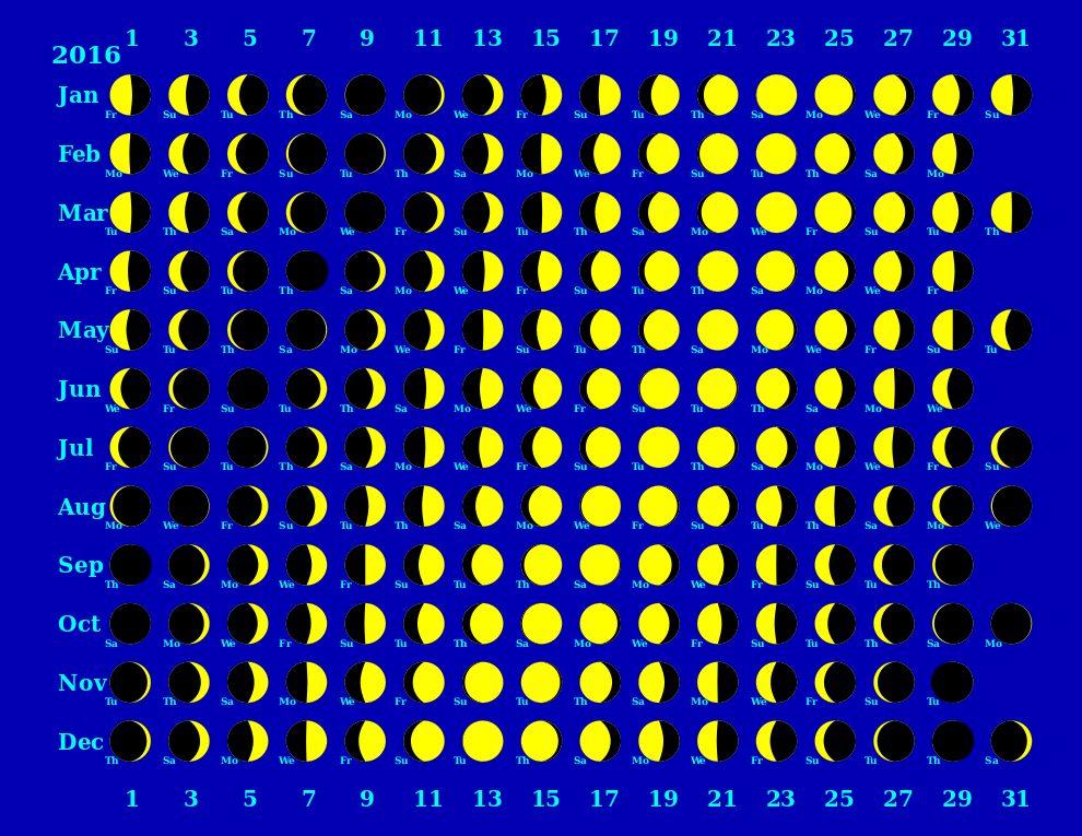This displays a blue calendar with the moon phases for 2016. Each day of the month is marked by a yellow circle, and each phase of the moon is represented by a black circle. There are twelve circles in total, one for each day of the month. The moon phases include new moon, first quarter, full moon, third quarter, and last quarter. The calendar is organized with the days of the week running horizontally across the top, while the moon phases are arranged vertically down the left side. This unique design allows users to easily track the moon's progression throughout the year.