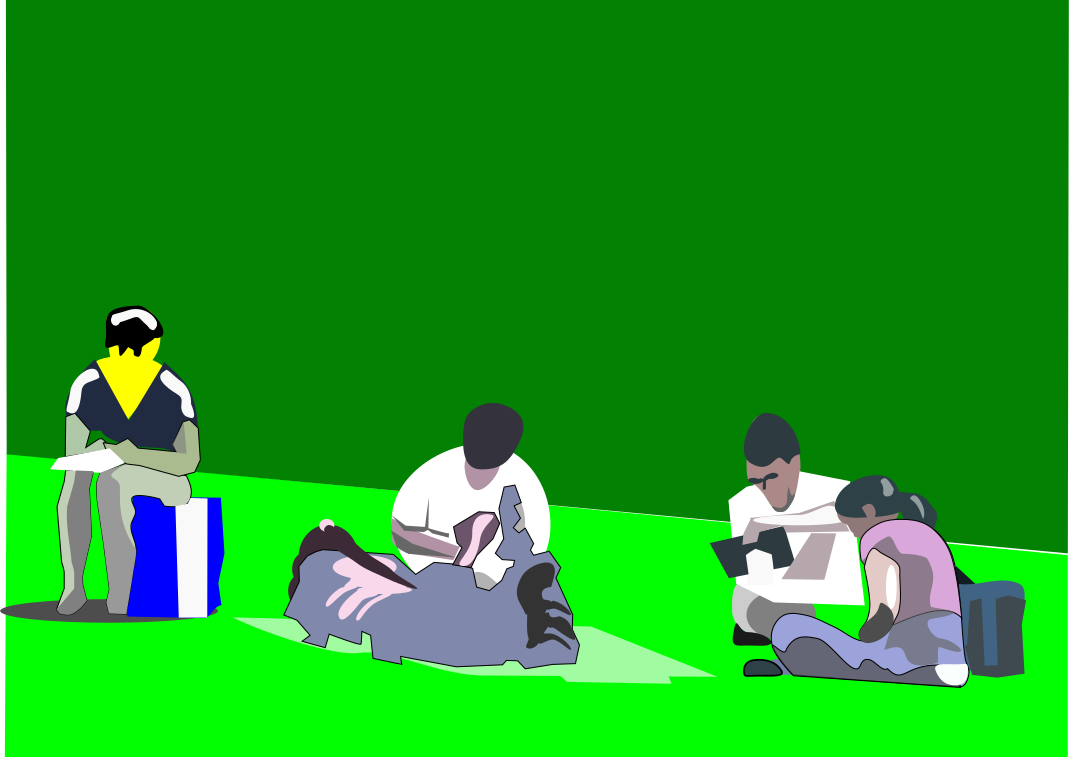 This features a group of four people sitting on the grass in a park. They are all engaged in different activities, with one person reading a book, another using a cell phone, and two others looking at something else. A backpack is placed near the right side of the scene, possibly belonging to one of the individuals. The overall atmosphere appears to be relaxed and leisurely as they enjoy their time outdoors.