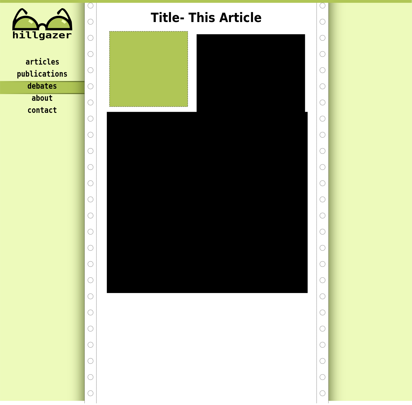 This displays a computer screen with a blank page that says "Title This Article" in the top left corner. Below this, there is a section for contact information and a list of publications. The screen also features a large green square in the middle, which takes up most of the space on the page.