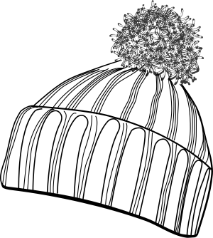 This features a black and white drawing of a knitted hat with a pompom on top. The hat is designed to look like an umbrella, giving it a unique and creative appearance. The drawing captures the intricate details of the hat's design, making it stand out as a piece of artwork or a decoration. The contrasting colors of black and white add depth and interest to the image, creating a visually appealing composition.