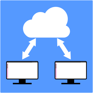 This features two desktop computers sitting side by side, both connected to the cloud. The cloud is represented by a large white cloud in the sky above the computers. This setup allows for easy sharing of resources and data between the two devices, making it an efficient way to work or collaborate on projects.