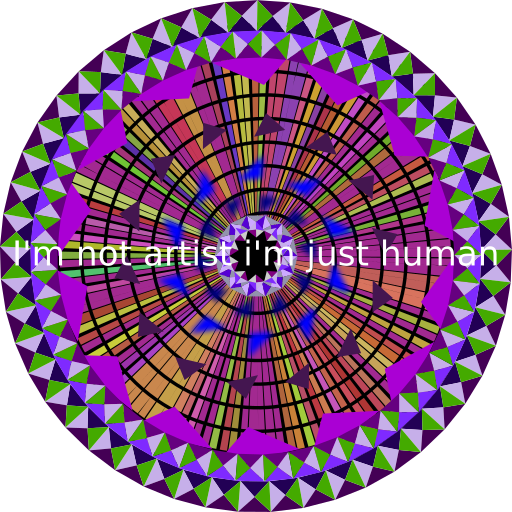 This is a colorful circle with a purple background and a blue center. It features an illustration of a wheel, which has the words "I'm not artist I'm just human" written in white letters on it. The design appears to be a combination of geometric shapes and vibrant colors, creating a visually appealing and artistic display.