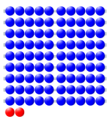 This features a large number of blue balls arranged in various positions. There are at least 13 distinct groups of blue balls, each varying in size and shape. Some of the larger groups consist of multiple rows or columns of blue balls, while others have a more irregular arrangement. In addition to the blue balls, there is one red ball located towards the bottom right corner of the image. The overall composition creates an interesting visual effect with the contrasting colors of the blue and red balls.