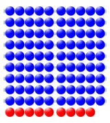 This features a large number of blue and red balls arranged in a grid pattern. There are twelve rows of blue balls, each row containing fourteen balls, and one row with five blue balls. In addition to the blue balls, there is also a single red ball placed among them. This unique arrangement creates an interesting visual effect that draws attention to both the blue and red balls. The overall composition of the image showcases a combination of colors and shapes, making it visually appealing and engaging for viewers.