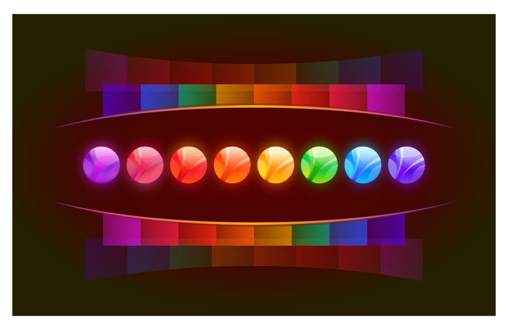 This features a black background with a circle in the center that is surrounded by seven colored circles. These circles are arranged in a circular pattern, each one varying in color from red to blue and back again. Above and below the circle, there are two rainbow-colored rectangles, adding an extra layer of visual interest to the scene. The overall effect creates a vibrant and eye-catching display that is reminiscent of a kaleidoscope or a colorful mandala.