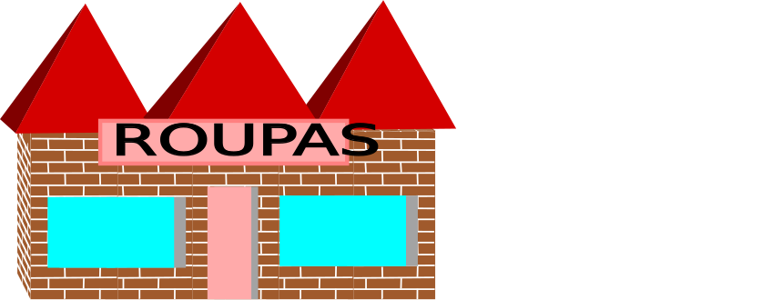 This features a red brick building with two blue windows on the front. Above the windows, there is a sign that reads "Roupas," which is the Portuguese word for clothes. The roof of the building is made from three right triangles, adding to its unique design. The overall appearance of the storefront gives off an old-fashioned vibe, with the red brick and blue windows creating a classic look.