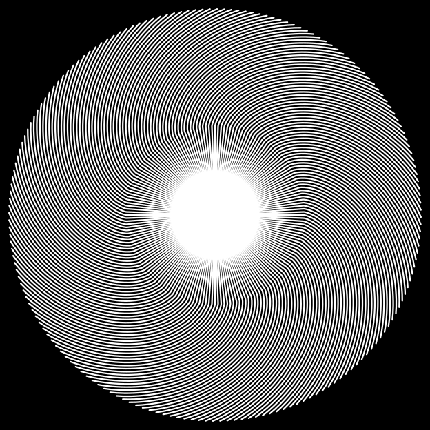 This features a large, round object with a bright white center. This central point is surrounded by numerous black and white spirals that are arranged in a circular pattern around the ball. The spirals vary in size and shape, creating an intricate and visually captivating design. The overall effect of this arrangement gives the impression of a swirling or spinning motion, drawing attention to the central point of the object.