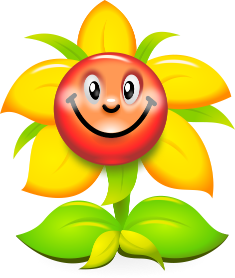 This features a bright and cheerful cartoon sunflower with a wide grin. It has yellow petals and green leaves at its bottom, giving it an appealing appearance. The sunflower is the main focus of the image, occupying most of the frame.