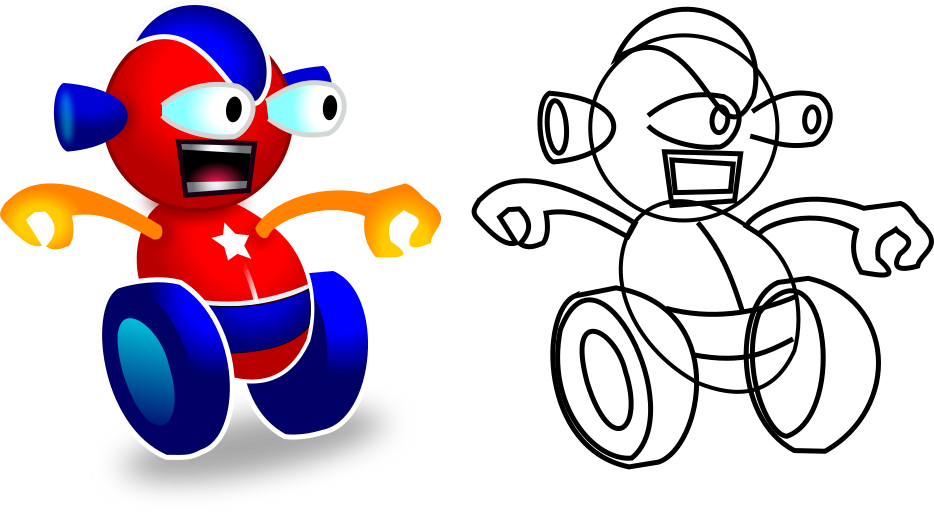 This features two robots, one of which is a cartoon-like character with a red and blue color scheme. This robot appears to be in motion, as it has its arms outstretched while standing on wheels. The other robot is a more abstract drawing, depicting a figure without any legs or wheels. Instead, the drawing features a circle for a head and two circles for hands. Both robots are positioned side by side, with the cartoon-like character occupying most of the frame while the drawing takes up a smaller portion of the image.