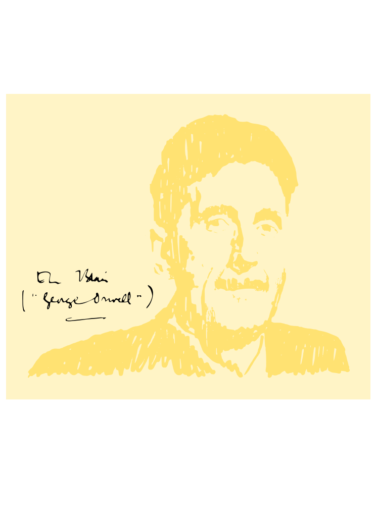 This is a yellow picture of George Orwell, an English author and journalist. He is known for his works such as "1984" and "Animal Farm." In the photo, he has a mustache and appears to be looking at something off-camera. The picture is in black and white with some yellow tones, giving it a vintage feel.