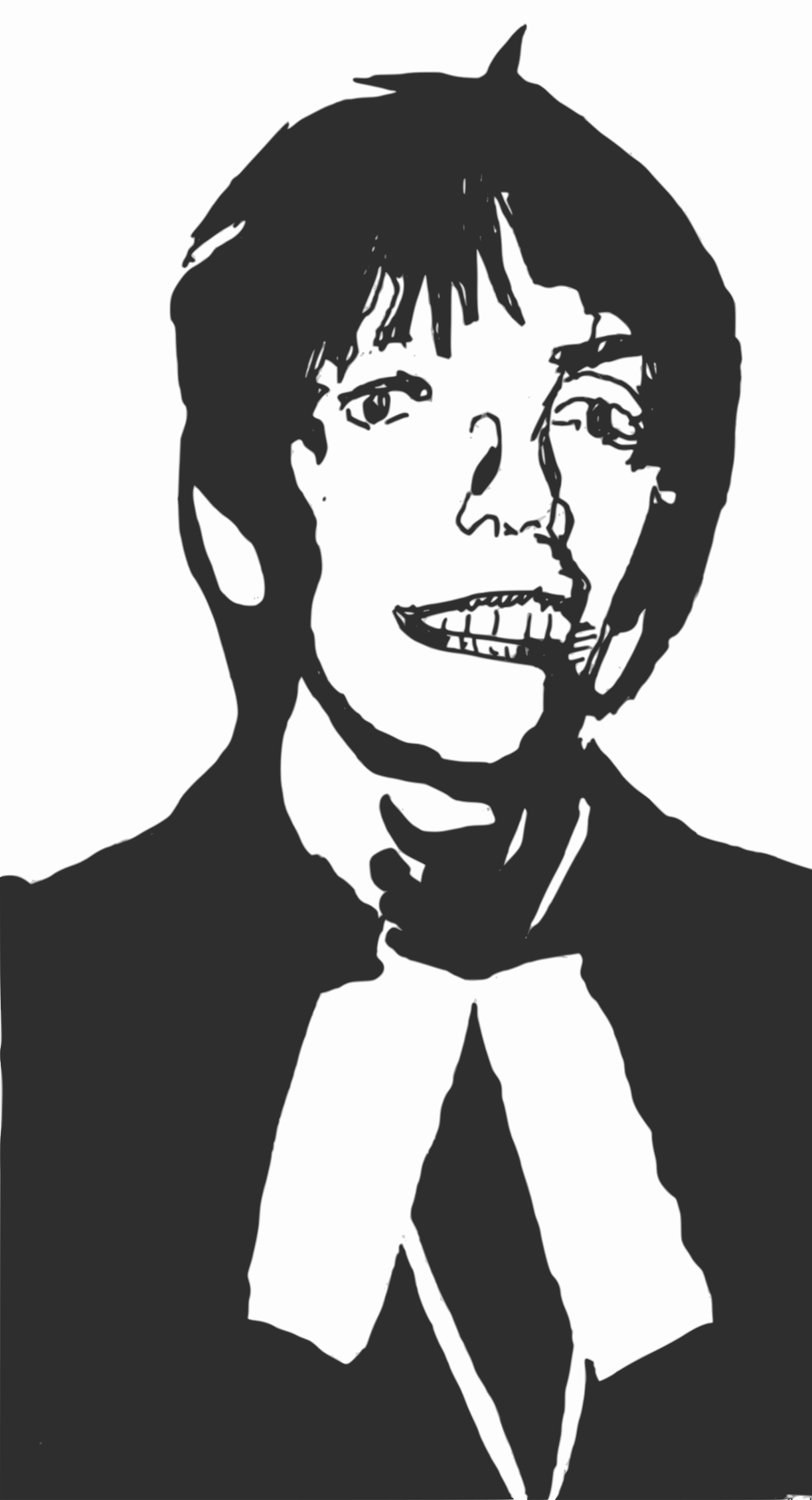 This features a black and white drawing of a man with a tie around his neck. He is wearing a suit, giving the impression that he might be dressed up for an event or formal occasion. The man's face is prominently displayed in the drawing, showcasing his attire and expression. The overall composition of the image creates a sense of formality and sophistication.