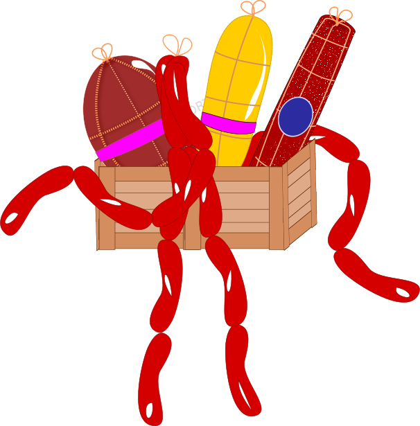 This features a cartoonish box filled with various types of meat, including hot dogs and sausages. There are at least four hot dogs in the box, each with different sizes and positions. Additionally, there is a large sausage occupying most of the space within the box. The arrangement of these meats creates an interesting and playful scene that showcases the variety of food items inside the cartoonish container.