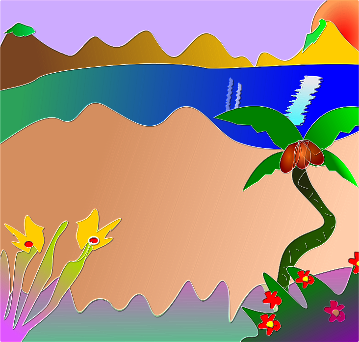 This features a vibrant scene with a beach, mountains, and a palm tree. The beach is adorned with small yellow and red flowers scattered throughout the area. In front of the beach, there are mountains that add to the picturesque landscape. A large plant with a flower on top can be seen in the foreground, creating an interesting focal point within the scene. This artistic composition showcases the beauty of nature and its various elements.