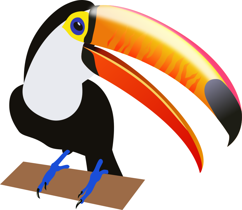 This features a colorful illustration of a black and white toucan with bright blue feet. The toucan has an oversized orange beak, which is one of its most distinctive characteristics. It stands on top of a wooden surface or table, giving the impression that it might be in a natural habitat or simply placed there for display. This unique bird's appearance and vibrant colors make it an interesting subject to observe and appreciate.