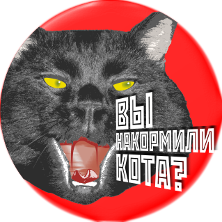This features a black cat with yellow eyes, making an angry face. It is situated in the center of a red circle and has Russian text on the right side of its head. The cat's mouth is open, showing its teeth, adding to its aggressive appearance. This unique design could be used for various purposes such as stickers or buttons, capturing attention with its bold colors and striking facial expression.