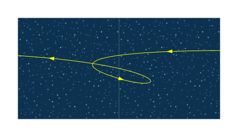 This features a blue sky with several stars scattered throughout the scene. There is a yellow trajectory of a planet in space, which appears to be moving through the vast expanse of the universe. Additionally, there are three arrows pointing towards different areas of the sky, indicating various directions or points of interest within the celestial landscape. The combination of these elements creates an intriguing and visually appealing representation of the cosmos.