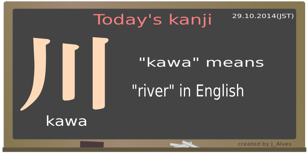 This features a blackboard with Japanese characters written on it. The first character is the kanji for "kawa" which means "river" in English. Below this, there are additional words explaining the meaning of the kanji in English. The board also has an arrow pointing to the right, indicating that the text is written in a foreign language.