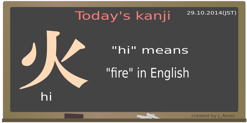 This features a blackboard with the word "hi" written in kanji, which is pronounced as "fire" in English. The board also has an explanation of what the word means in English underneath it. This visual aid helps to teach and learn foreign languages by providing clear translations for words or phrases. The image was created by J_Alves, who has shared their work with others.